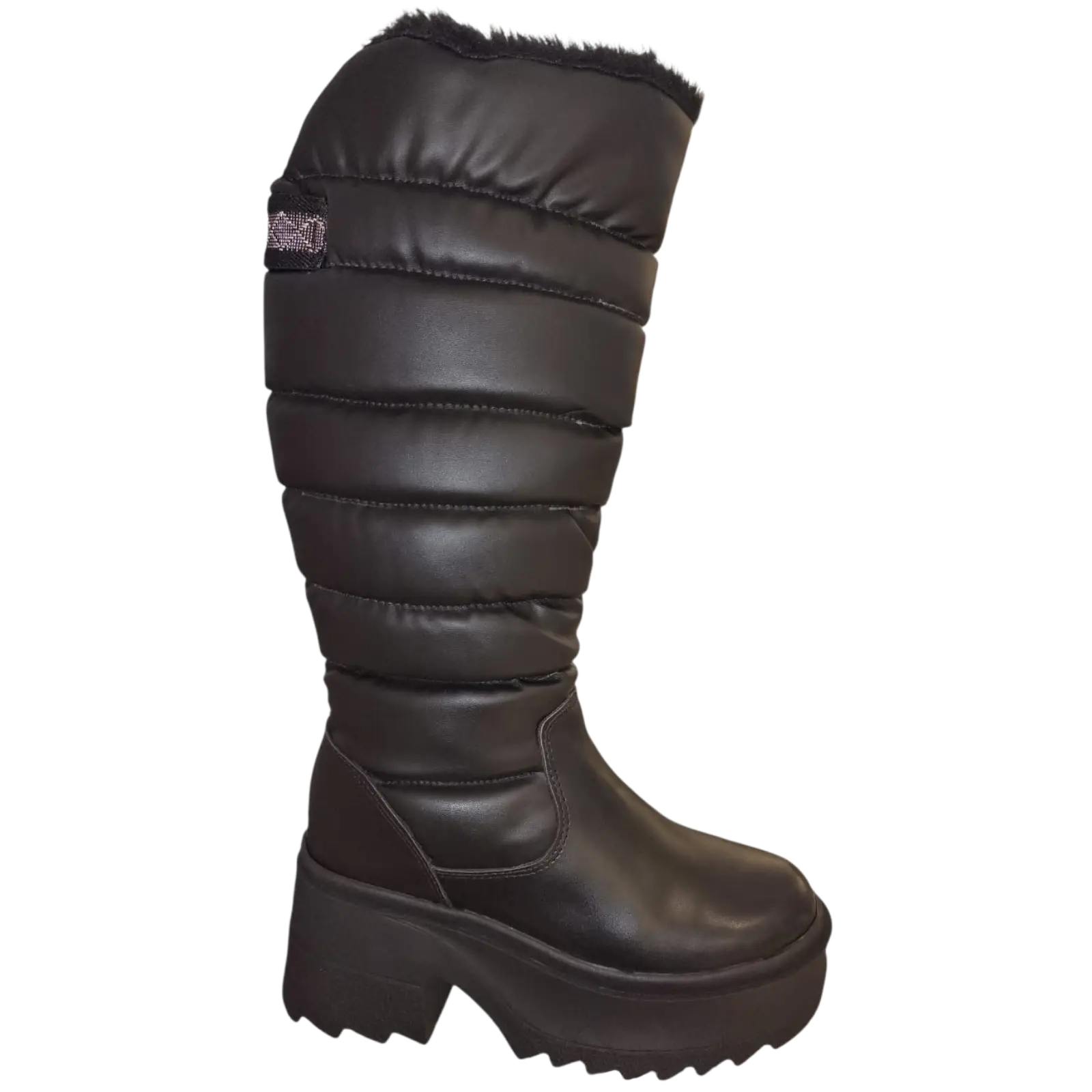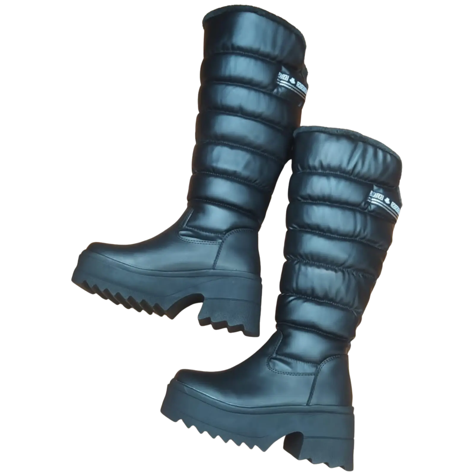 Bota Alaska negra para mujer, caña alta acolchada con detalle de cinta plateada. Plataforma con suela antideslizante y diseño térmico ideal para clima frío. Botas de invierno cómodas, modernas y fáciles de combinar para looks urbanos.