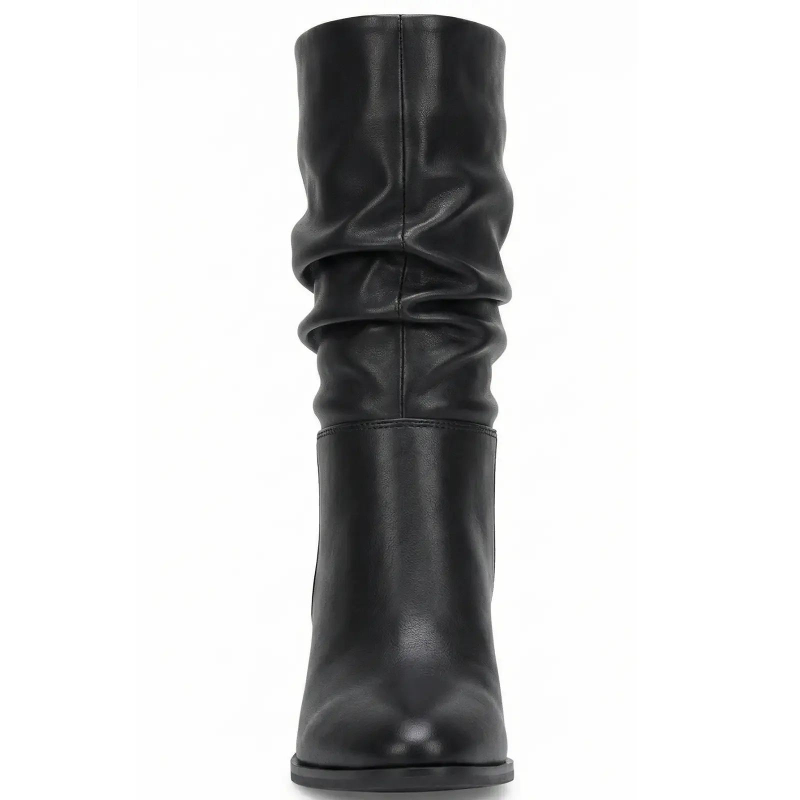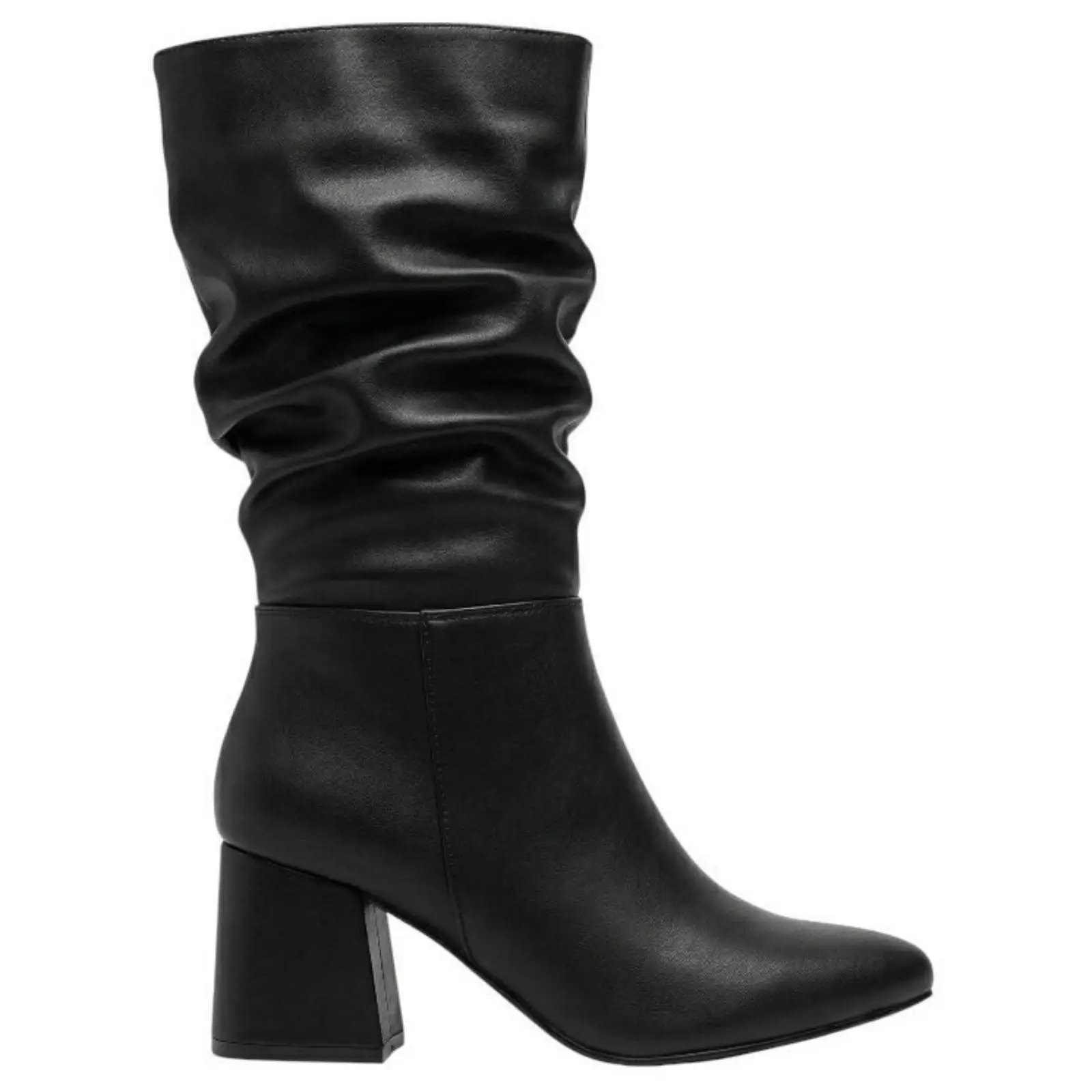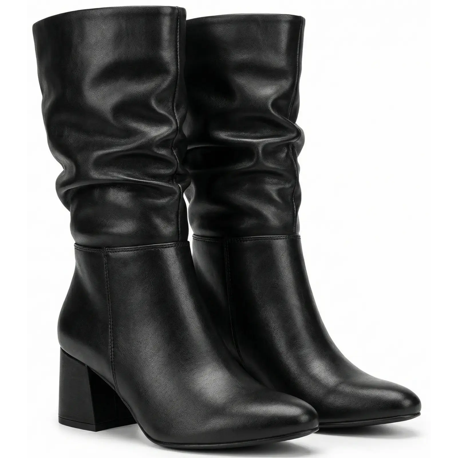 Esta bota caña media arrugada polipiel destaca por su diseño actual con efecto arrugado en la parte superior, que añade textura y personalidad al outfit. El tacón grueso proporciona estabilidad y confort para caminar con seguridad durante el día.