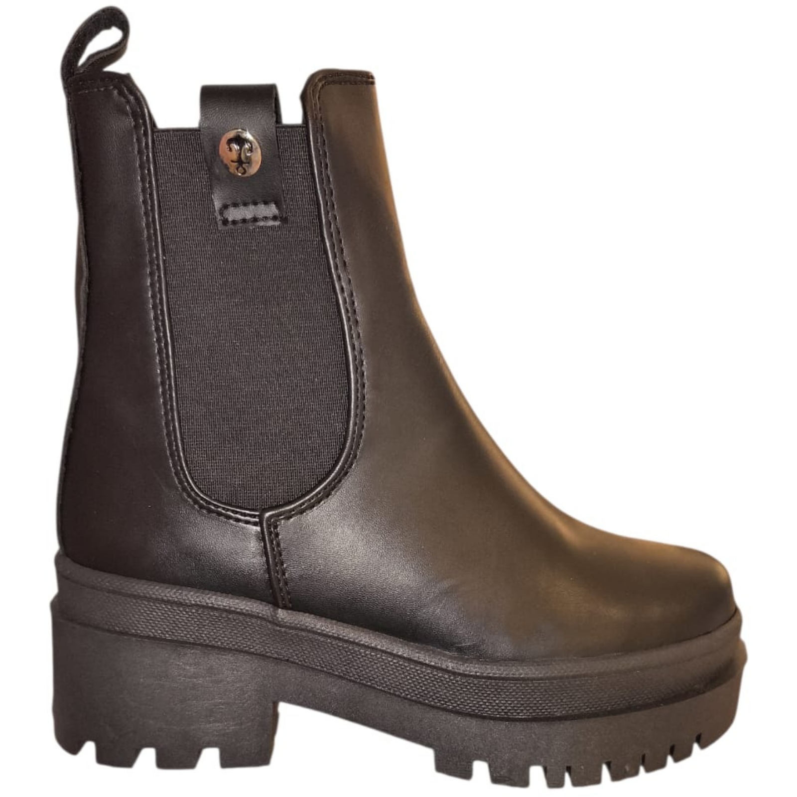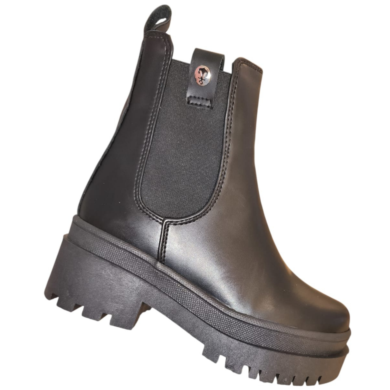 Bota chelsea negra para mujer con elástico lateral, suela track dentada y plataforma cómoda. Ideal para looks urbanos, oficina o salida: combina con jeans, vestidos y pantalón. Calzado femenino moderno, estable y fácil de poner.