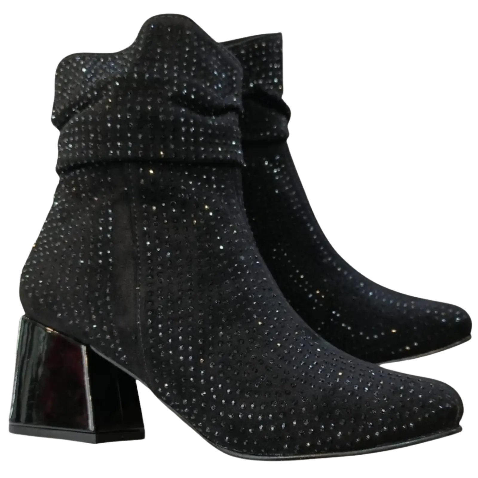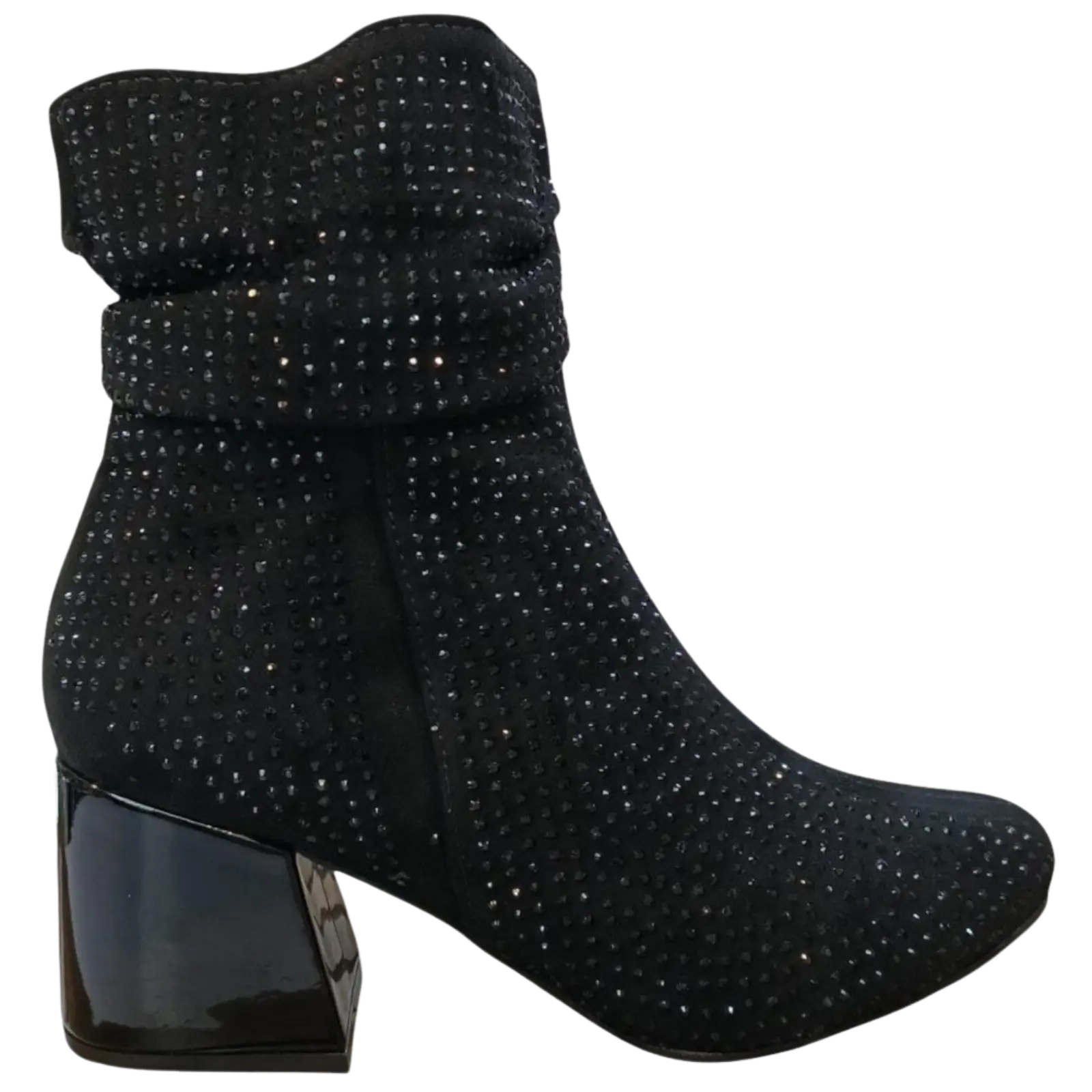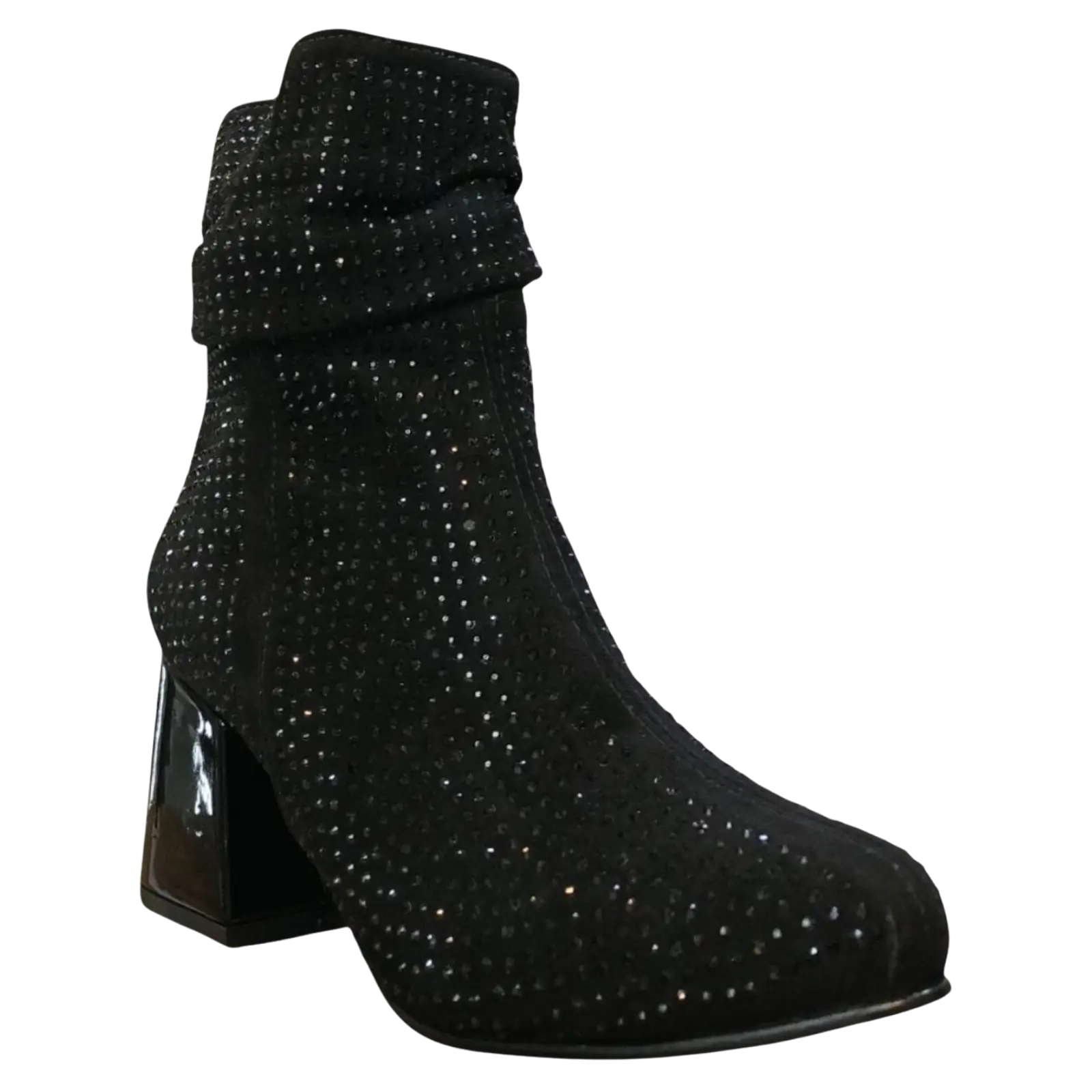 El botín negro gamuzado es una opción sofisticada para quienes buscan un calzado elegante con un toque llamativo. Su acabado tipo gamuza aporta textura y estilo, mientras que los detalles brillantes realzan el diseño.